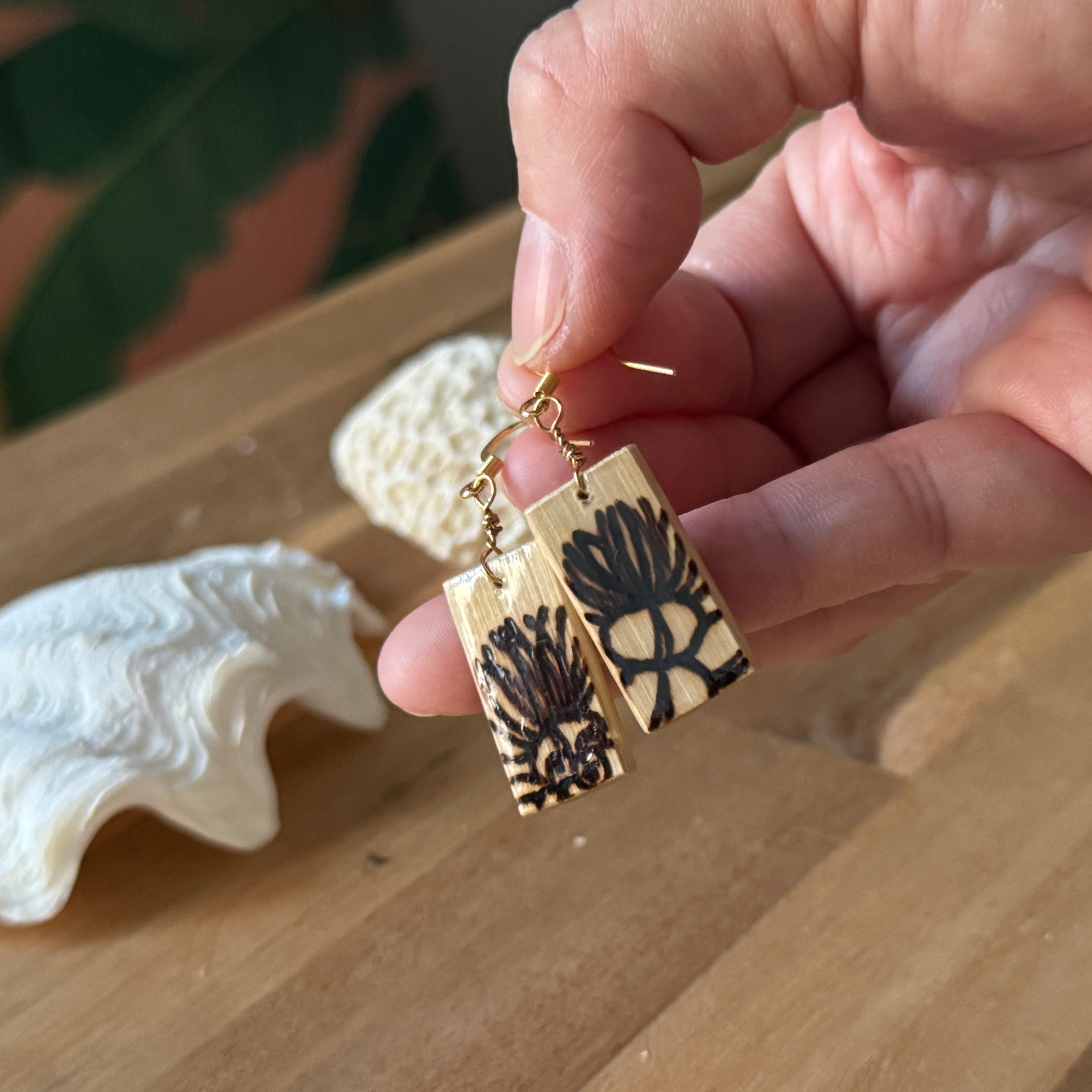 ハワイ島の島の花【レフア】を手作業で焦がし入れた竹製のピアスです。
