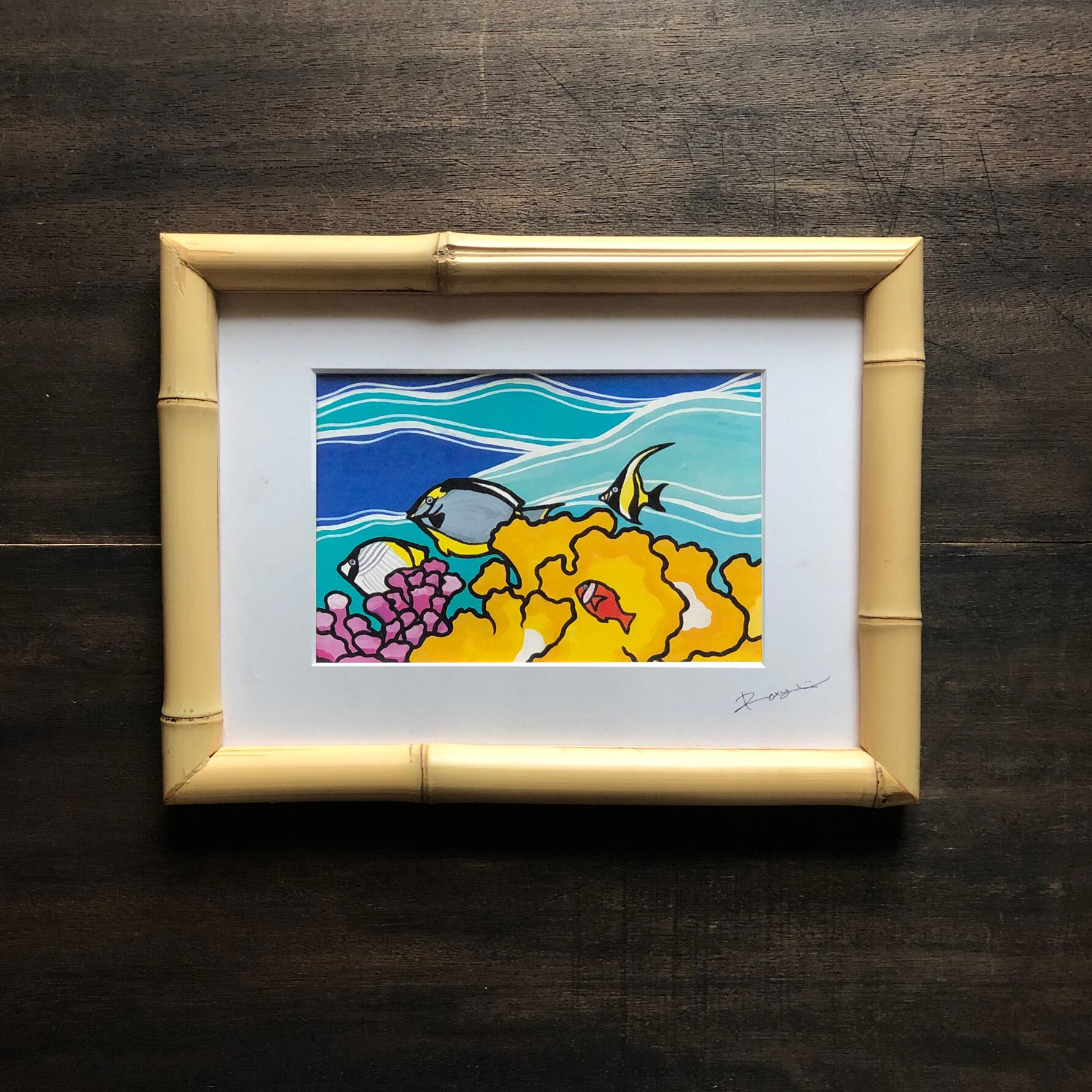 カラフルなお魚とサンゴ礁、美しい沖縄・伊良部島の海の中を描いた作品です。