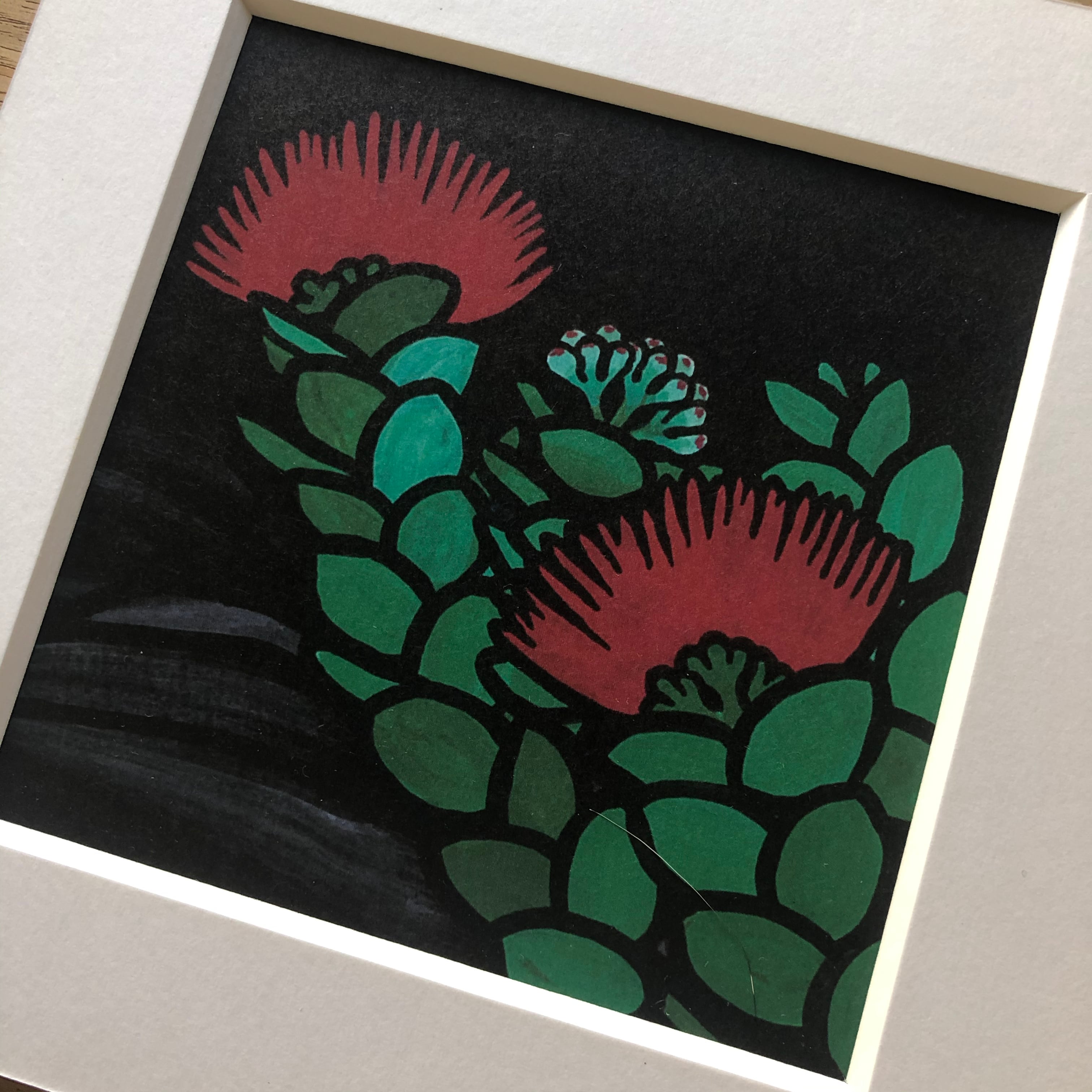 オヒアレフアをアクリル絵の具で描き、ケント紙にオフセット印刷した作品です。