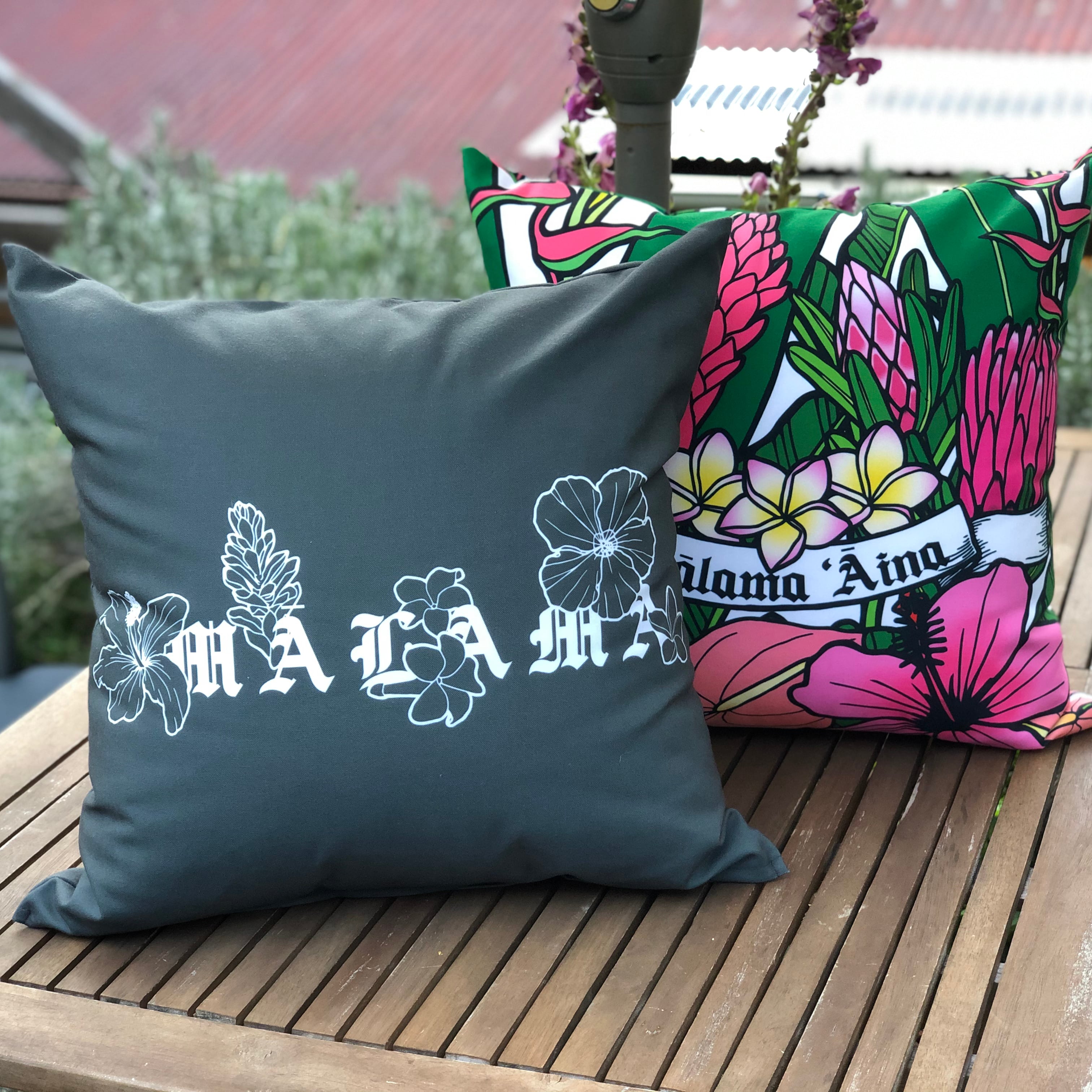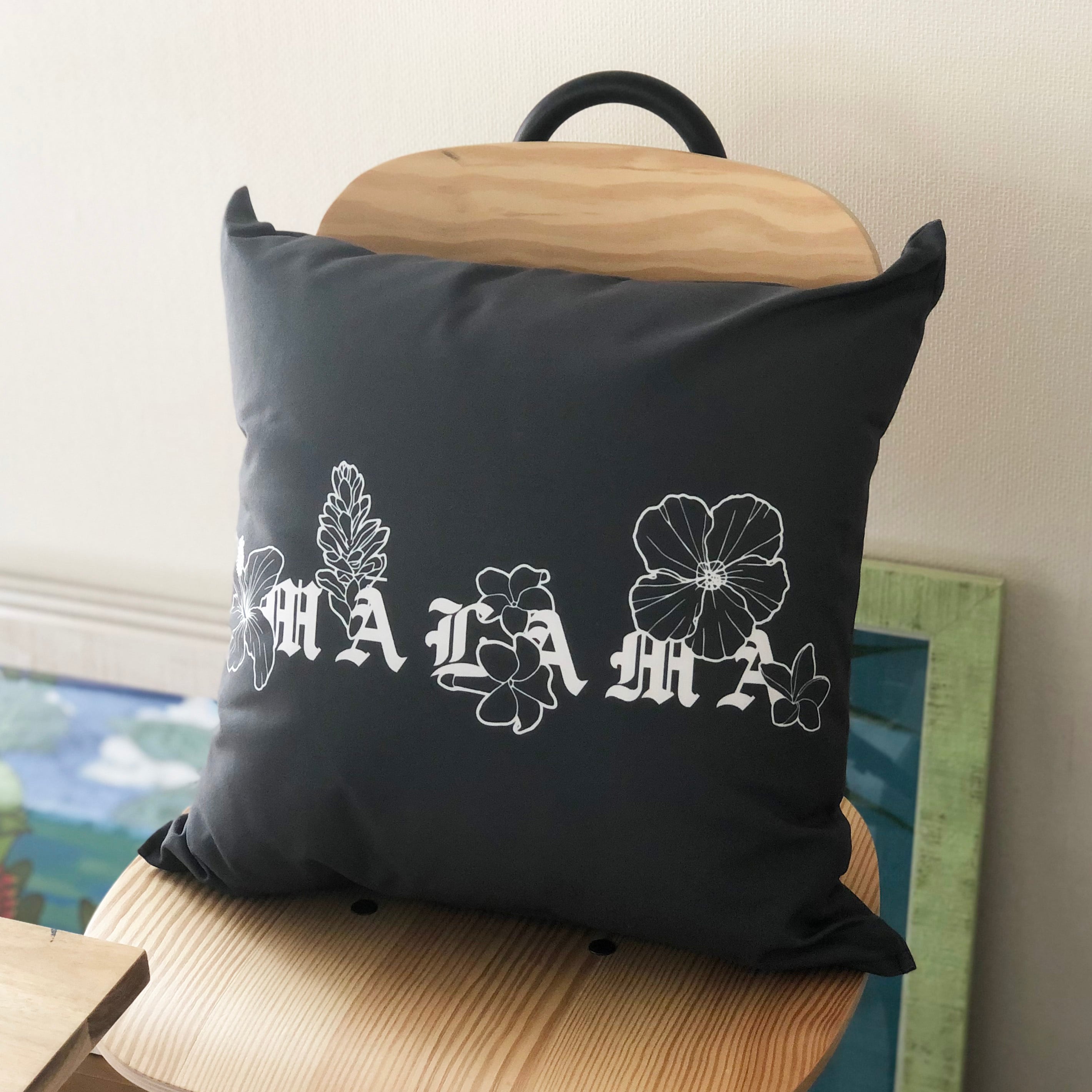 ブランド名【MĀLAMA(ハワイ語で大切に守るという意味)】と南国の花をイラストにし、組み合わせたデザインをクッションカバーにしました!