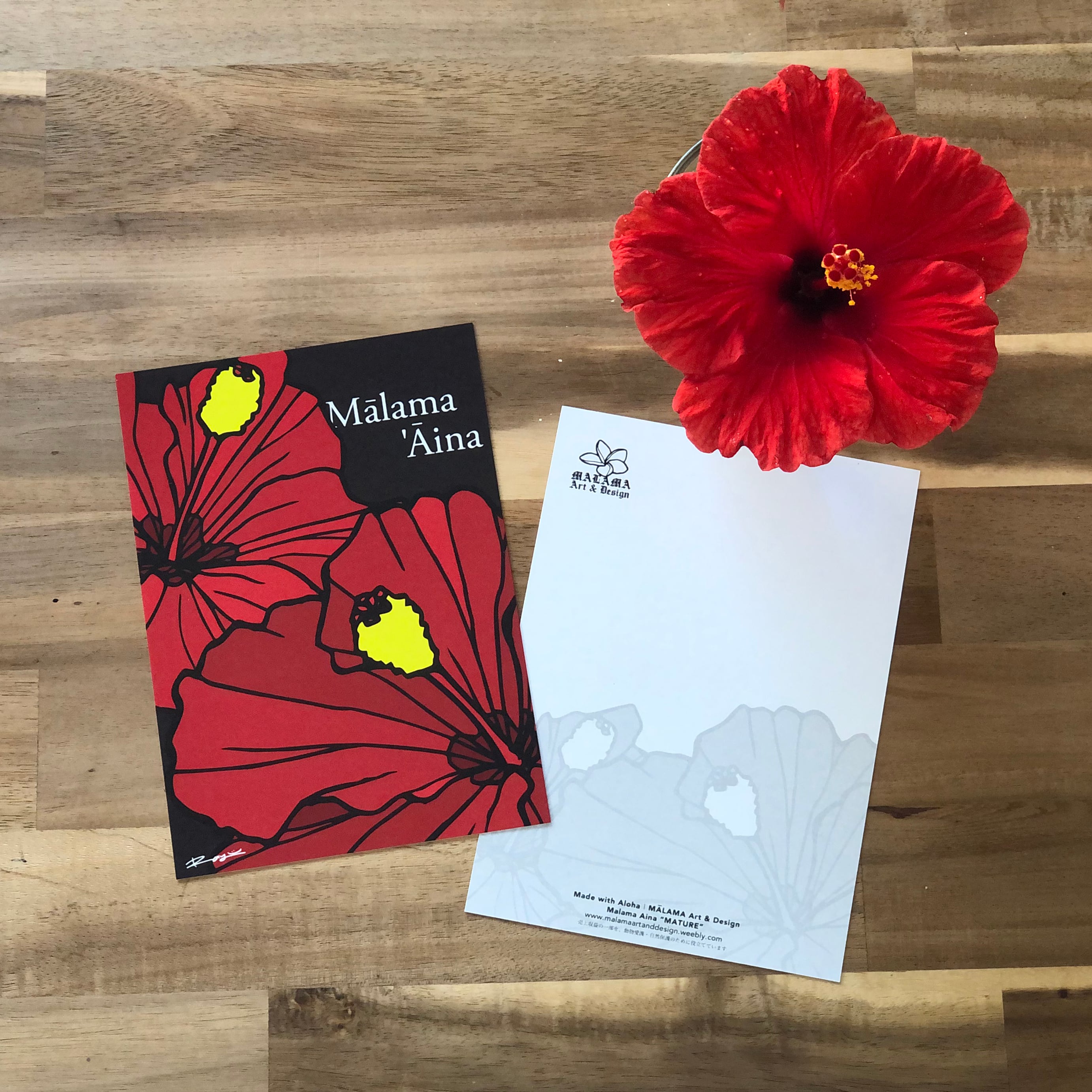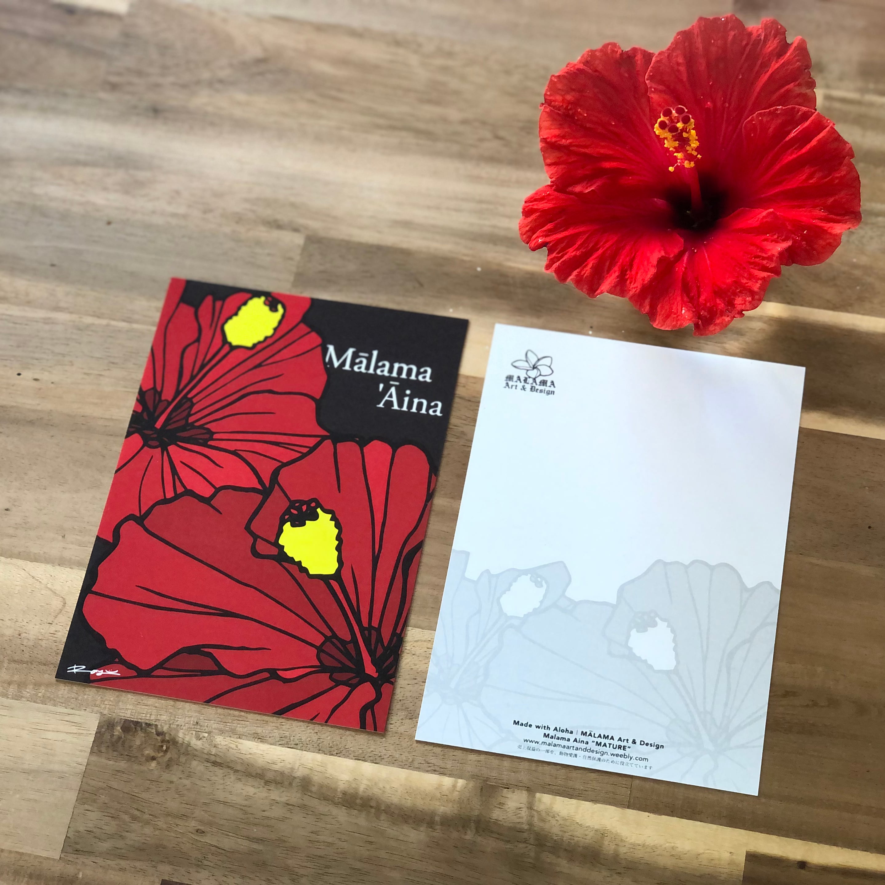 背景は濃いブラウンに落ち着いた、深い赤のハイビスカスに「MĀLAMA 'ĀINA」ハワイ語で自然を大切に!の言葉を入れた、秋冬にも使えるハワイアンなポストカードです。