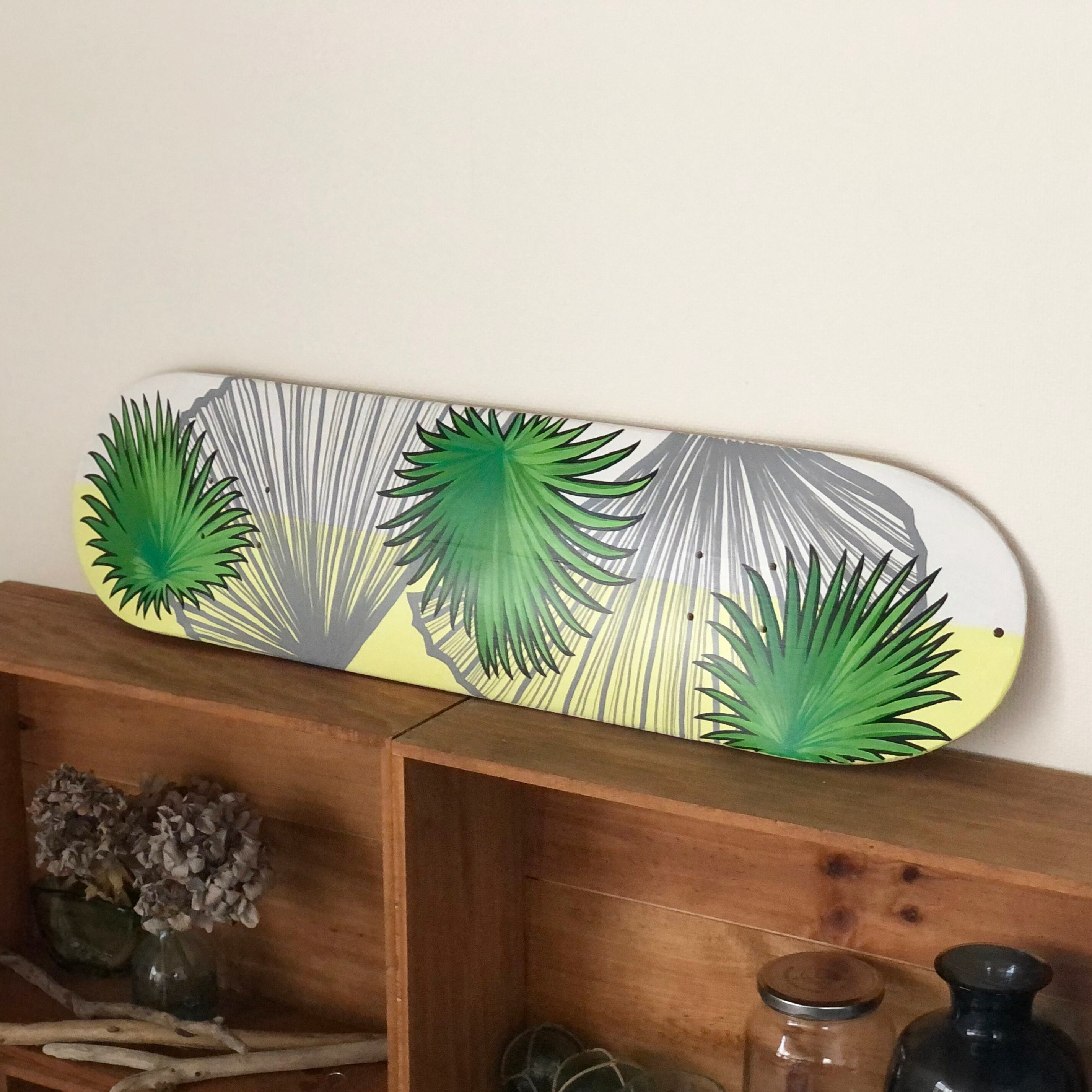 アクリル絵具でクバ(ビロウ)の葉を描いたスケートボードデッキ。