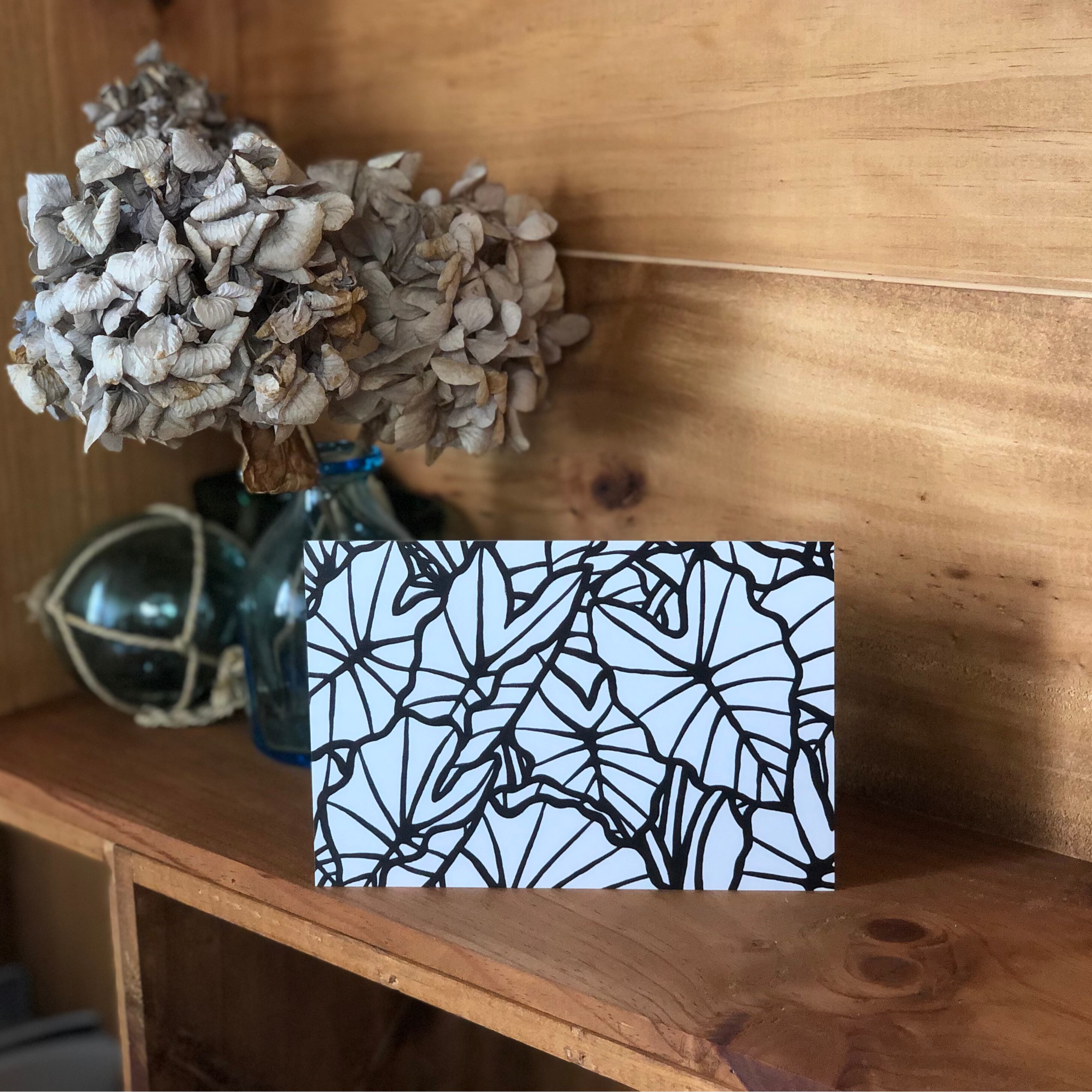 そのタロの葉を白と黒のみで全面に描いたモダンな作品をポストカードにしました!