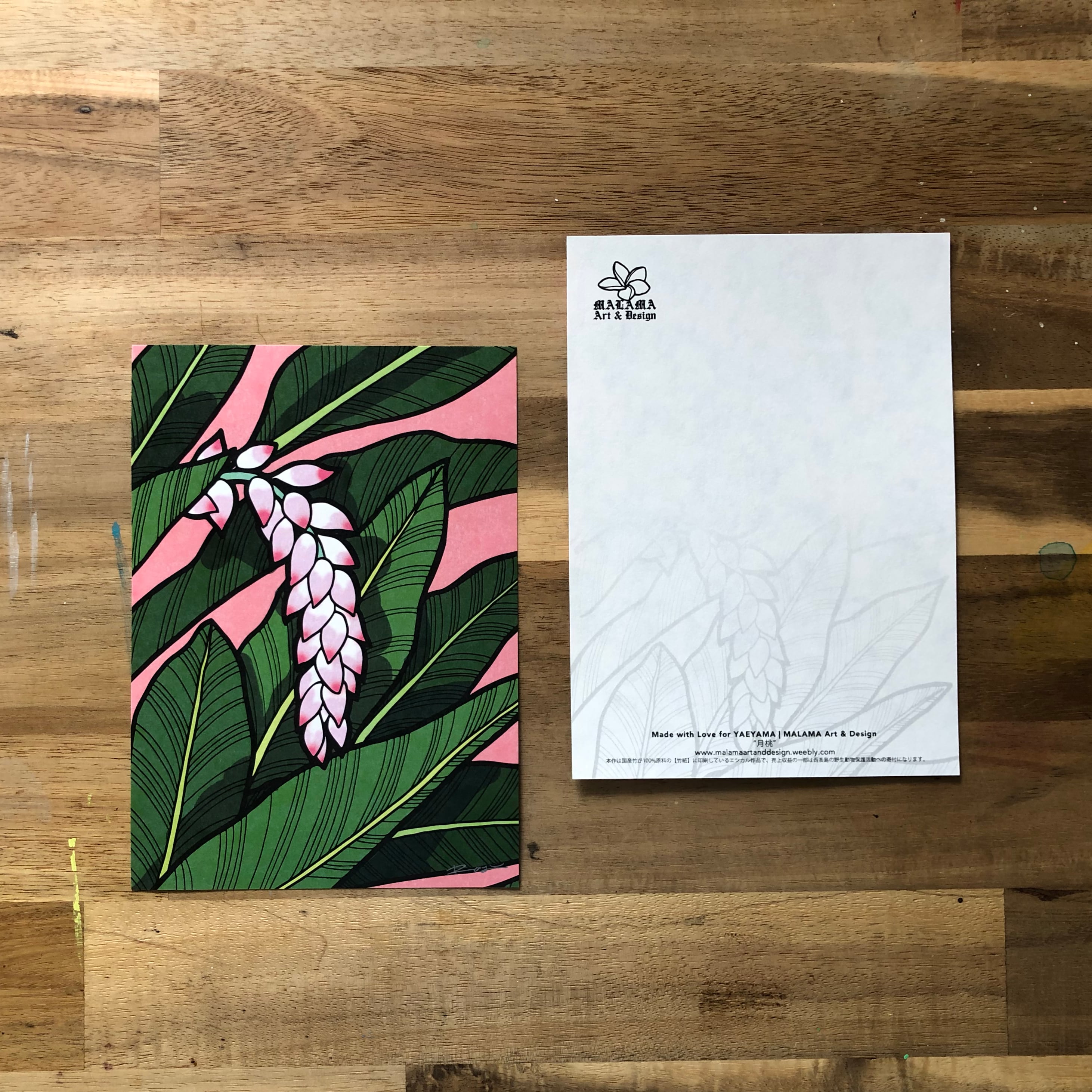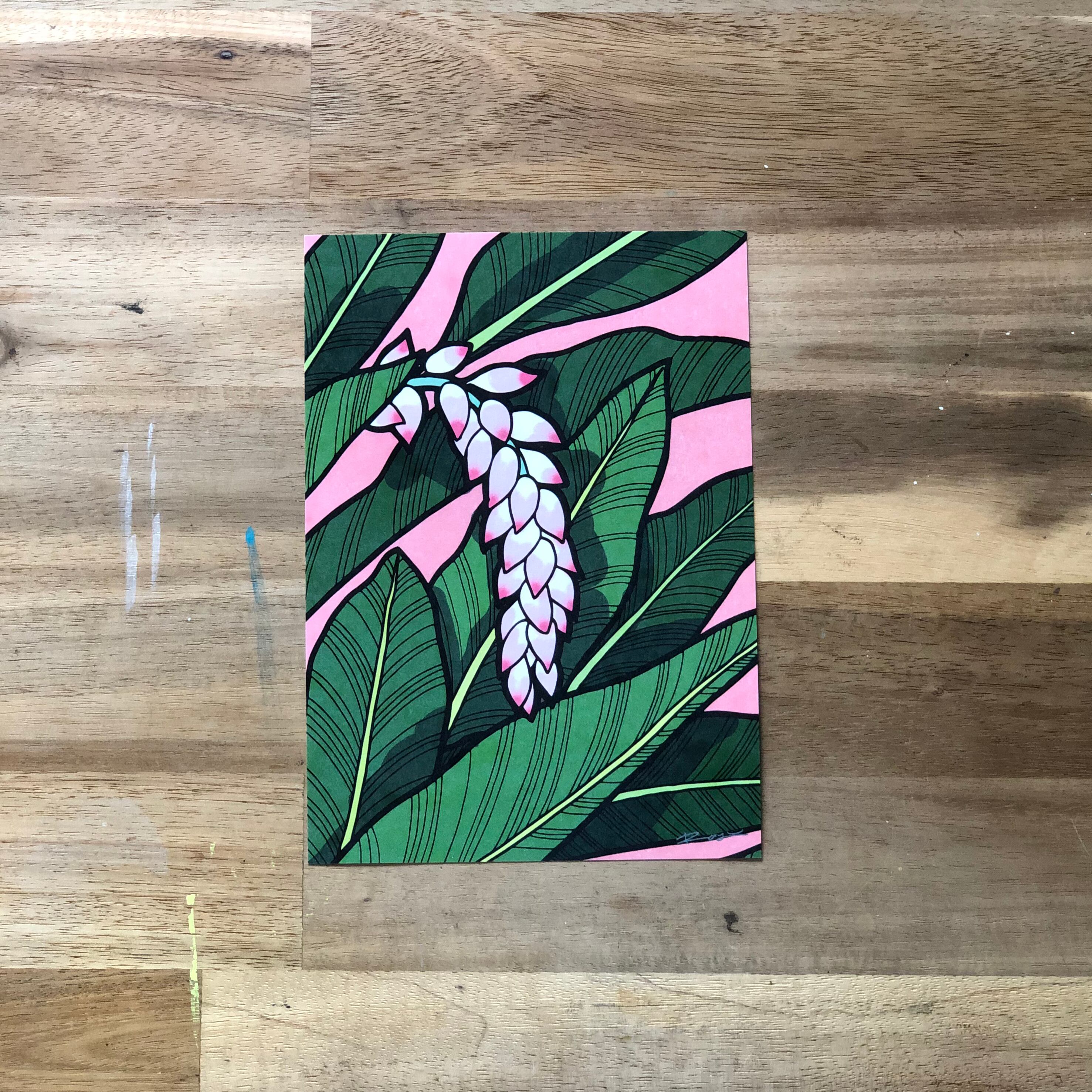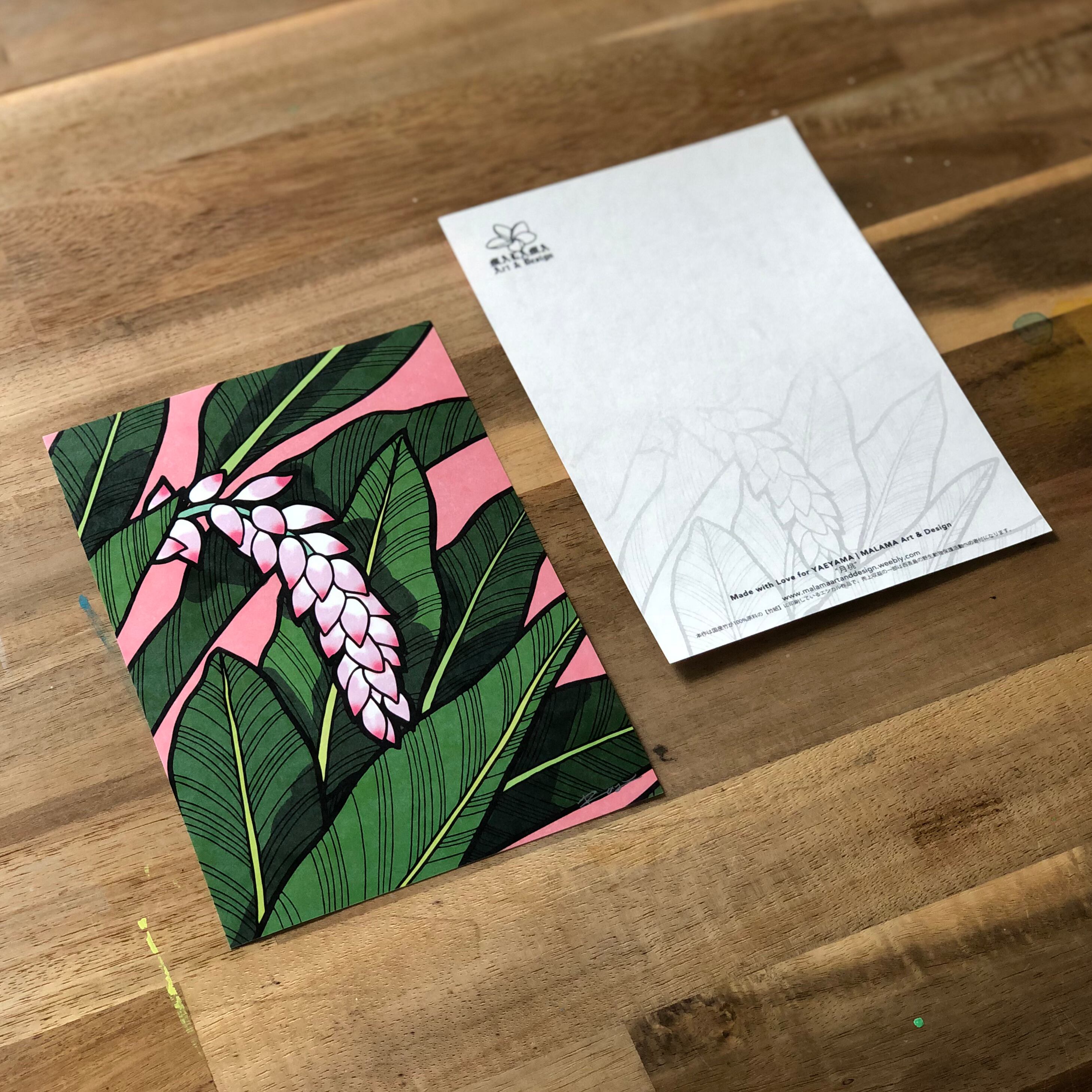 ハワイや沖縄に咲く、月桃(Shell Ginger)の花をイラストにしたポストカード。