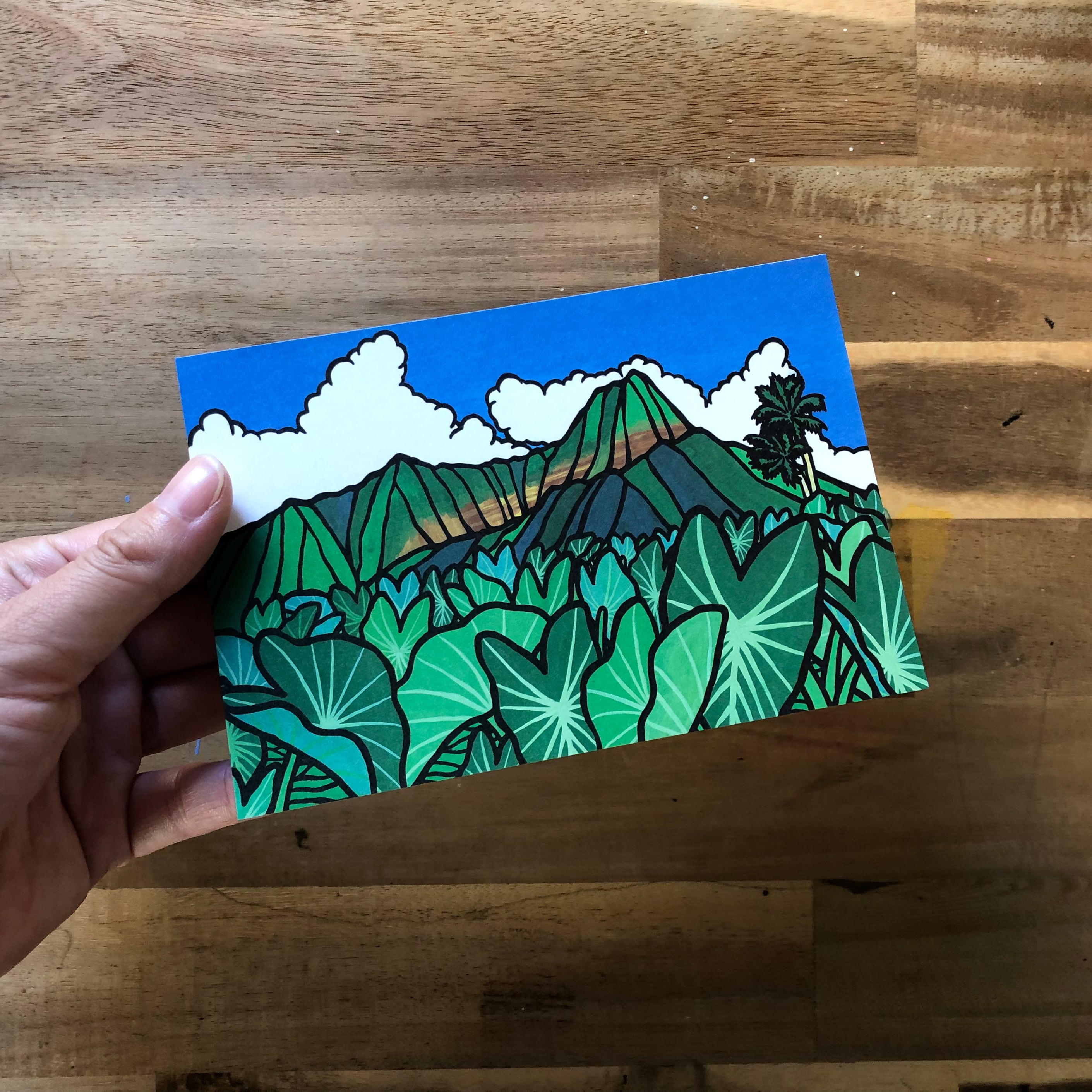 そんな昔のワイキキの田園風景をアクリル絵の具で描き、オフセット印刷した作品です。