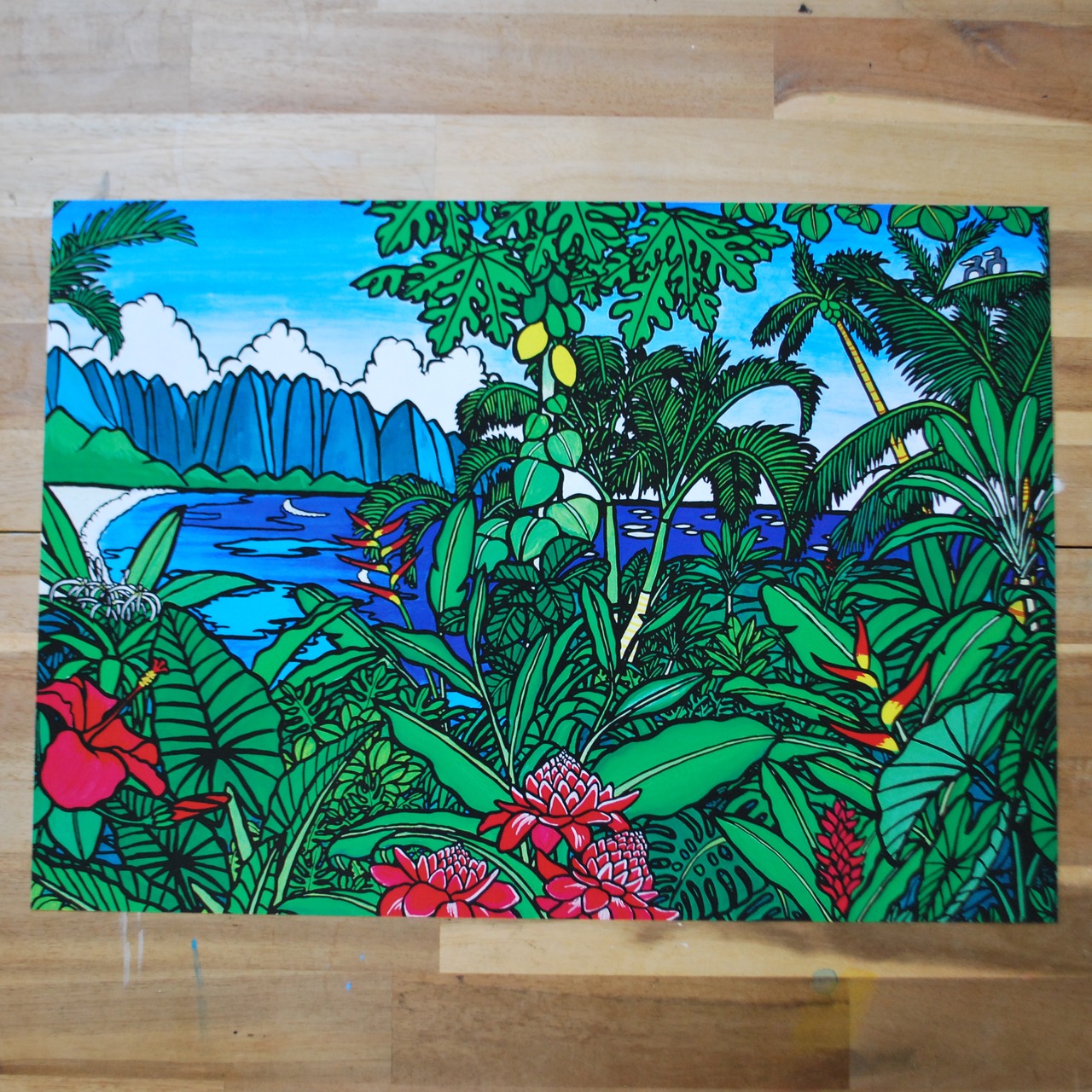 パパイヤ木を挟んで右がタヒチ、左はハワイ寄りのイメージで描きました。