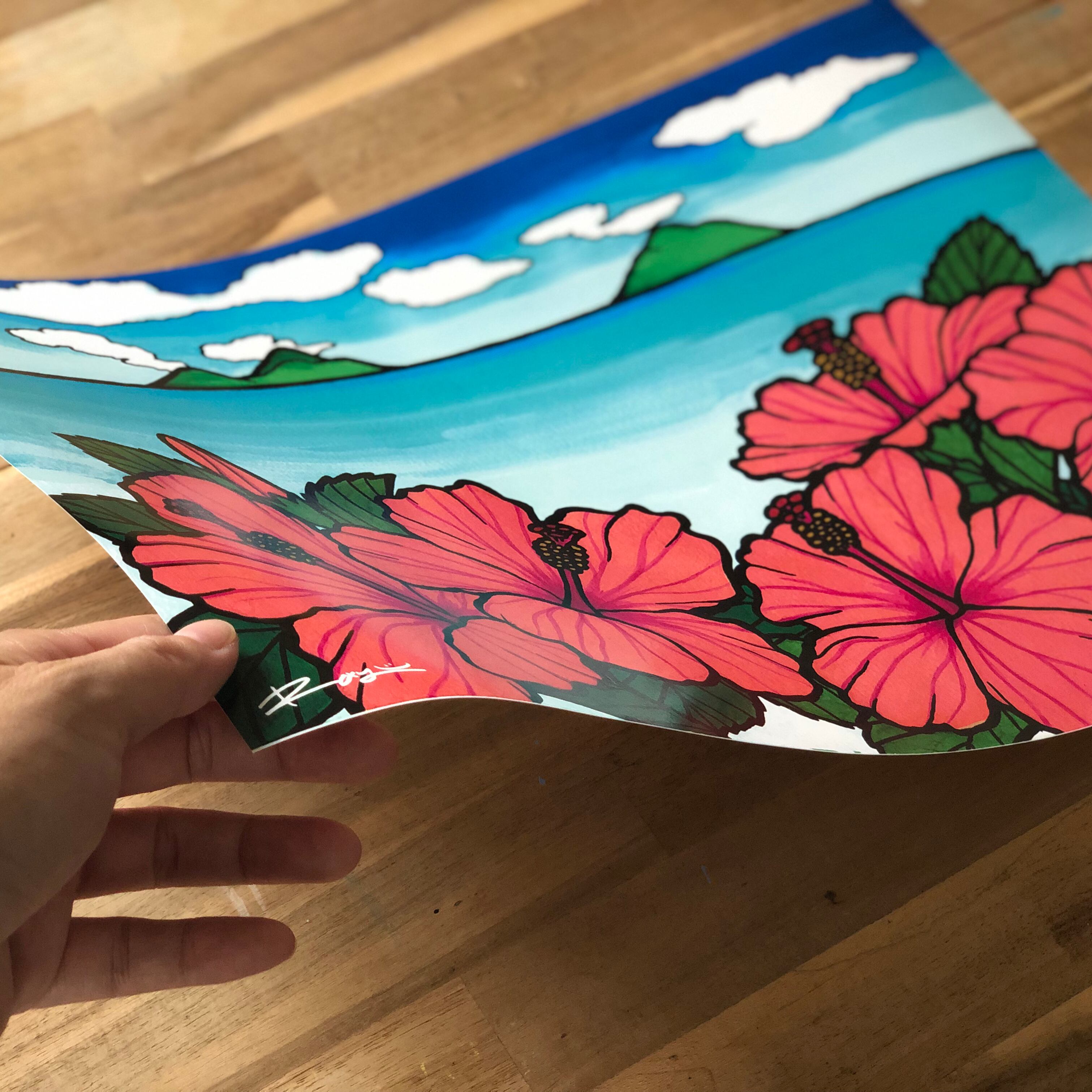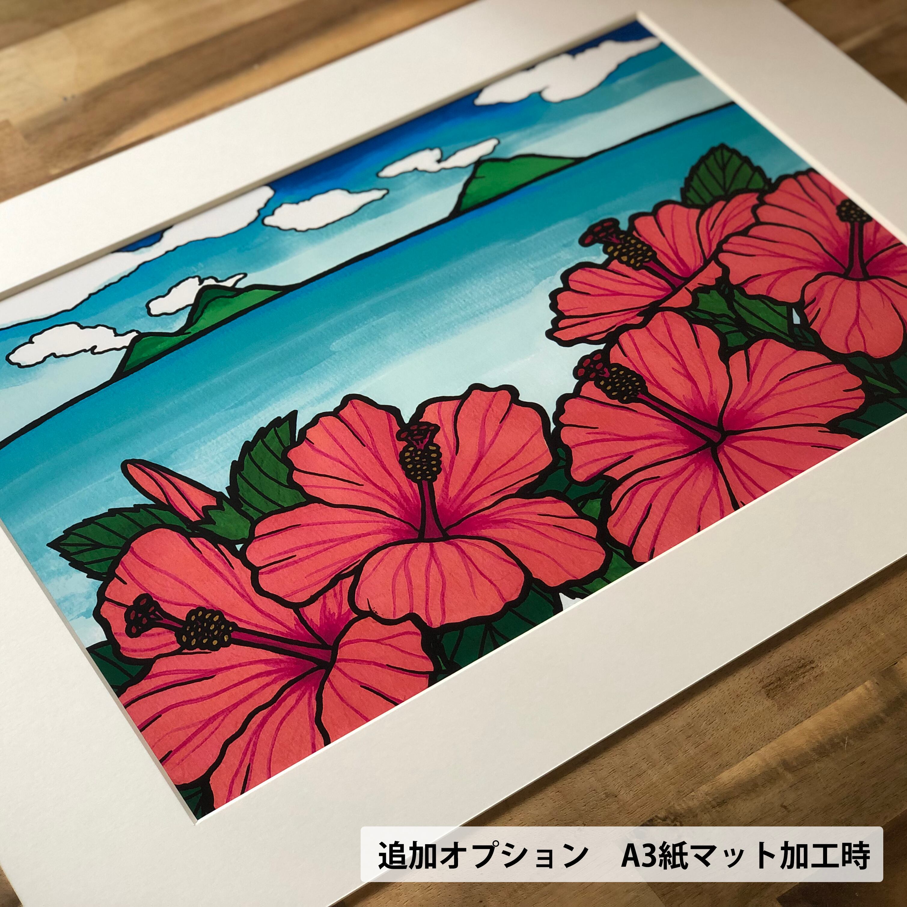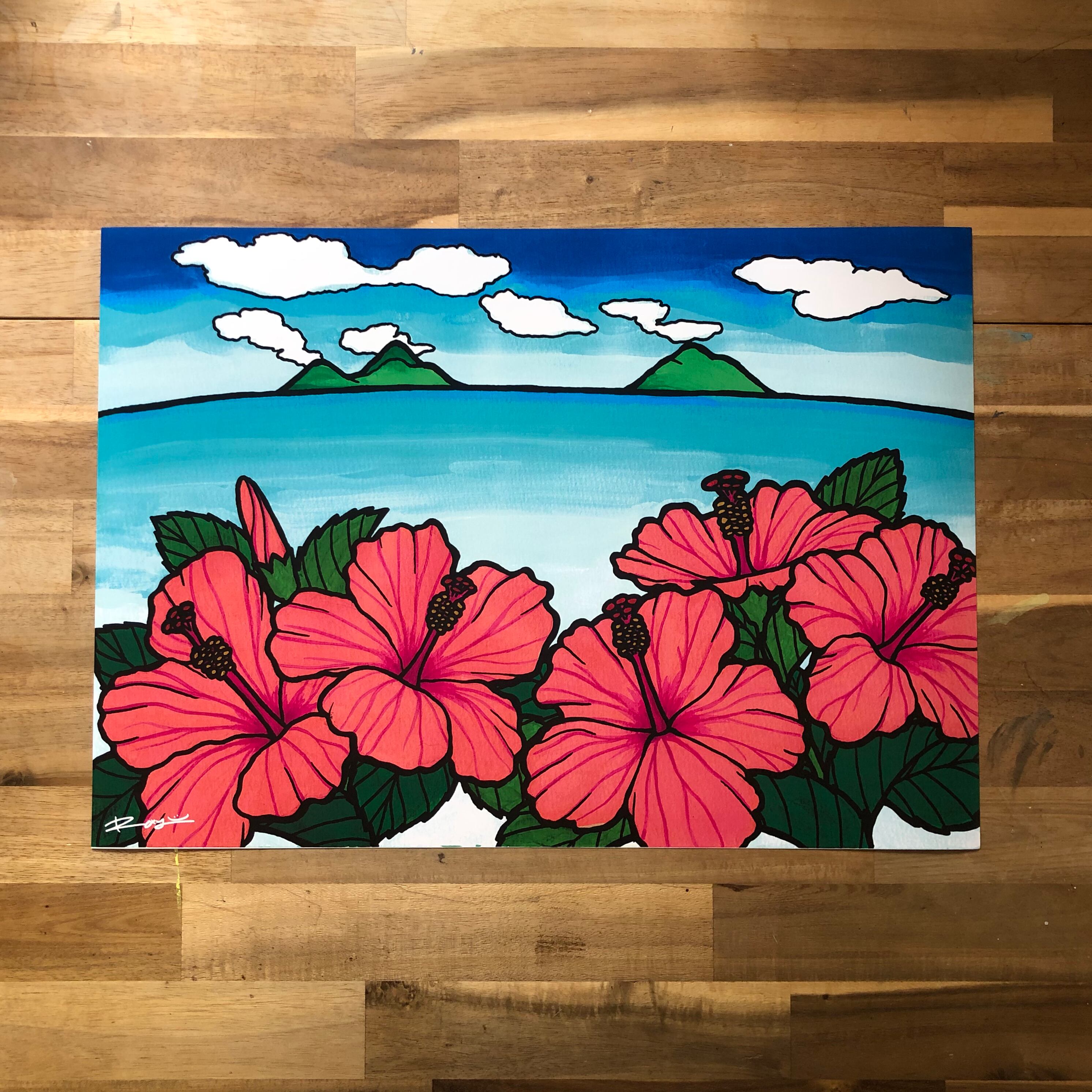 ピンクのハイビスカス越しにカイルアビーチから見たモクルア島を描いた作品です。