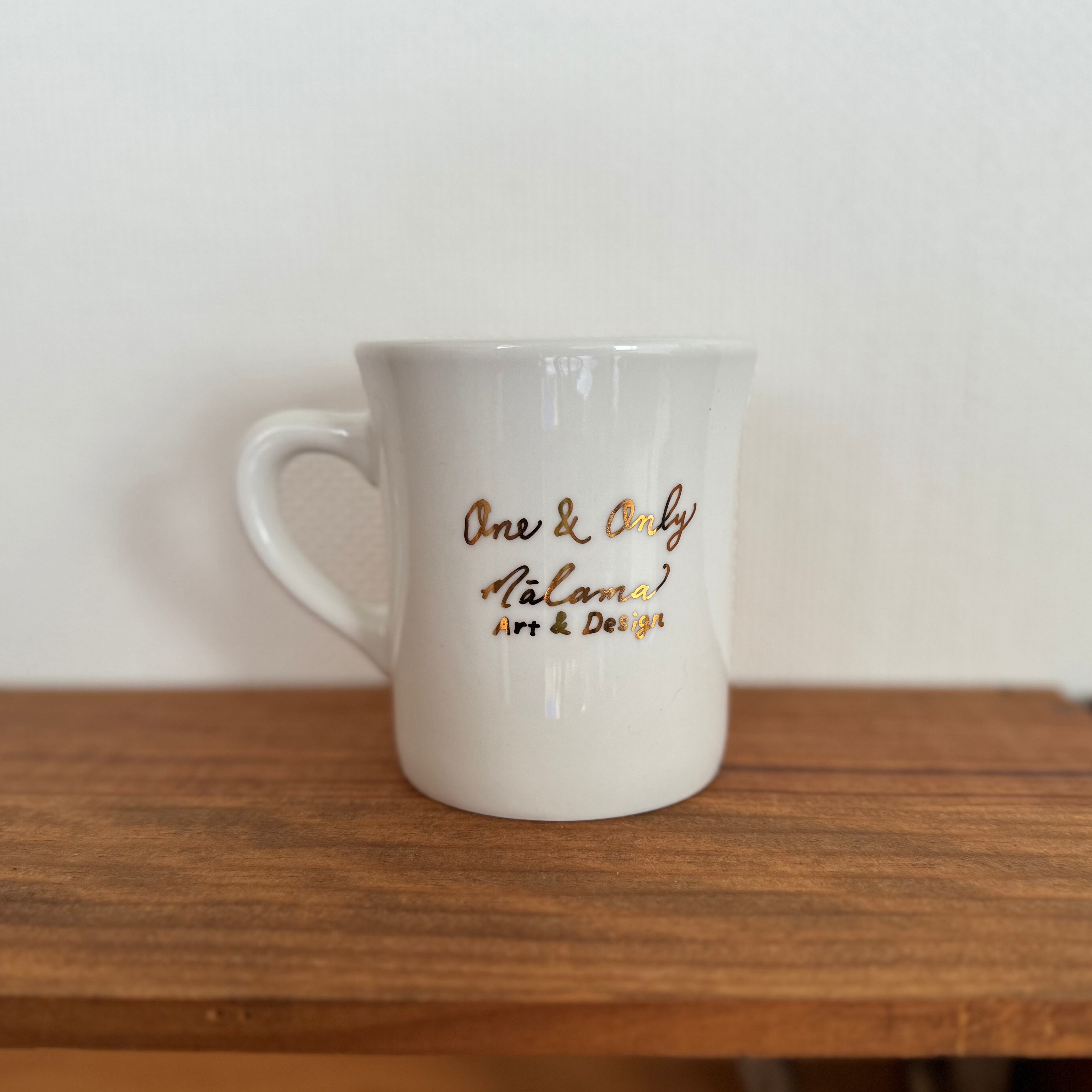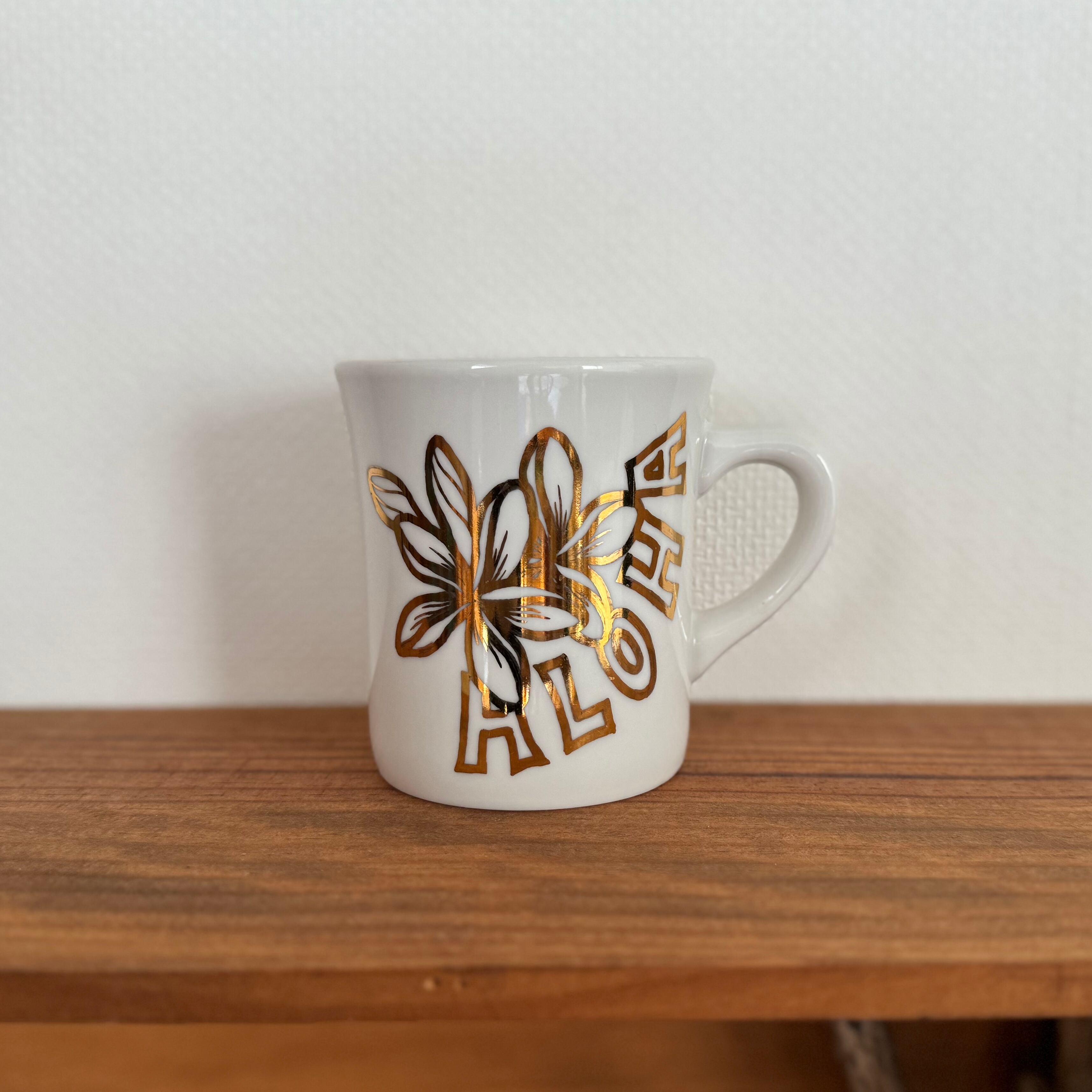 アメリカのダイナーで出て来るような厚口のマグカップにゴールドのアートがキラキラしていてとっても可愛いです。
