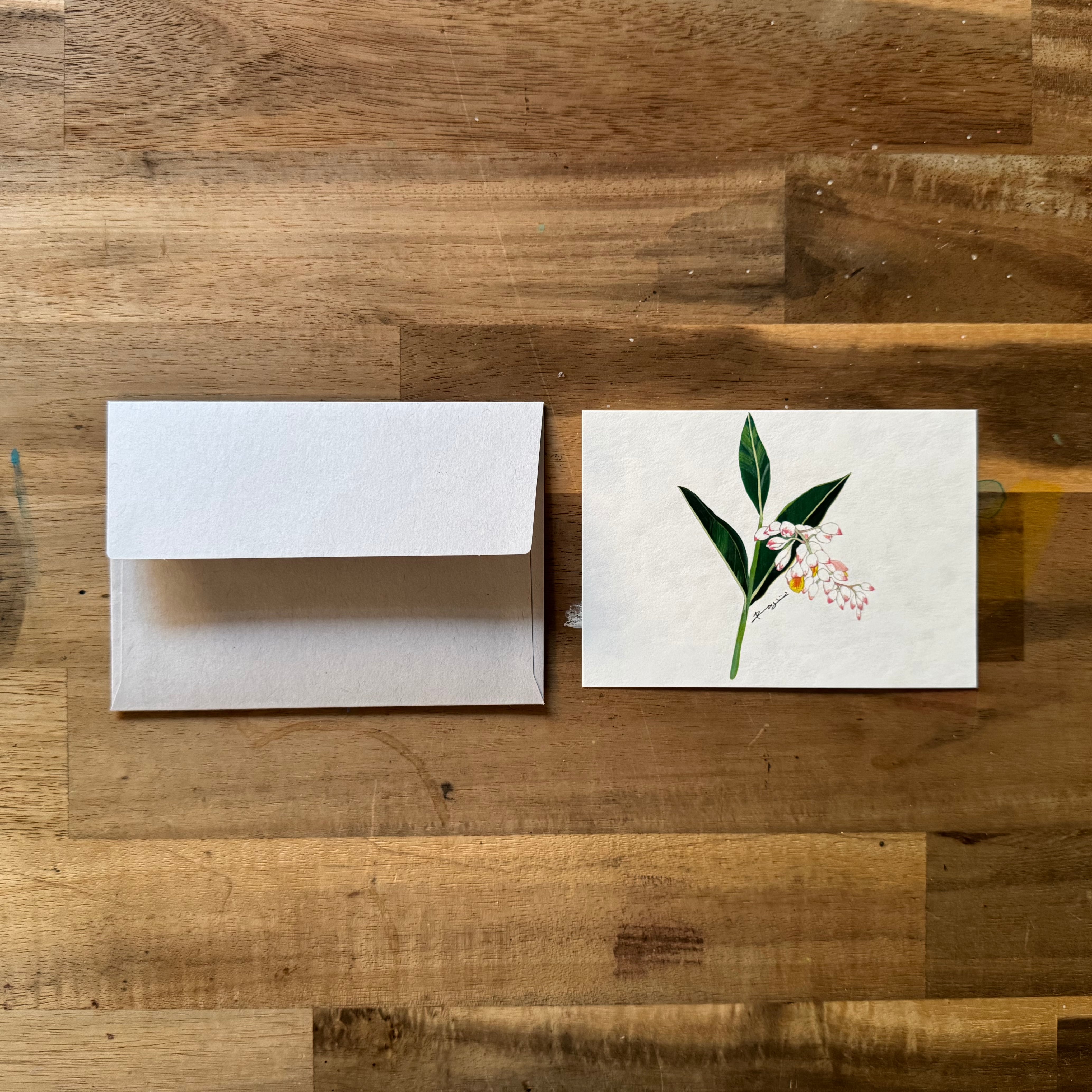 サガリバナ、アダン、月桃をアクリル絵の具で描き、シンプルで優しいカードに仕上がりました。