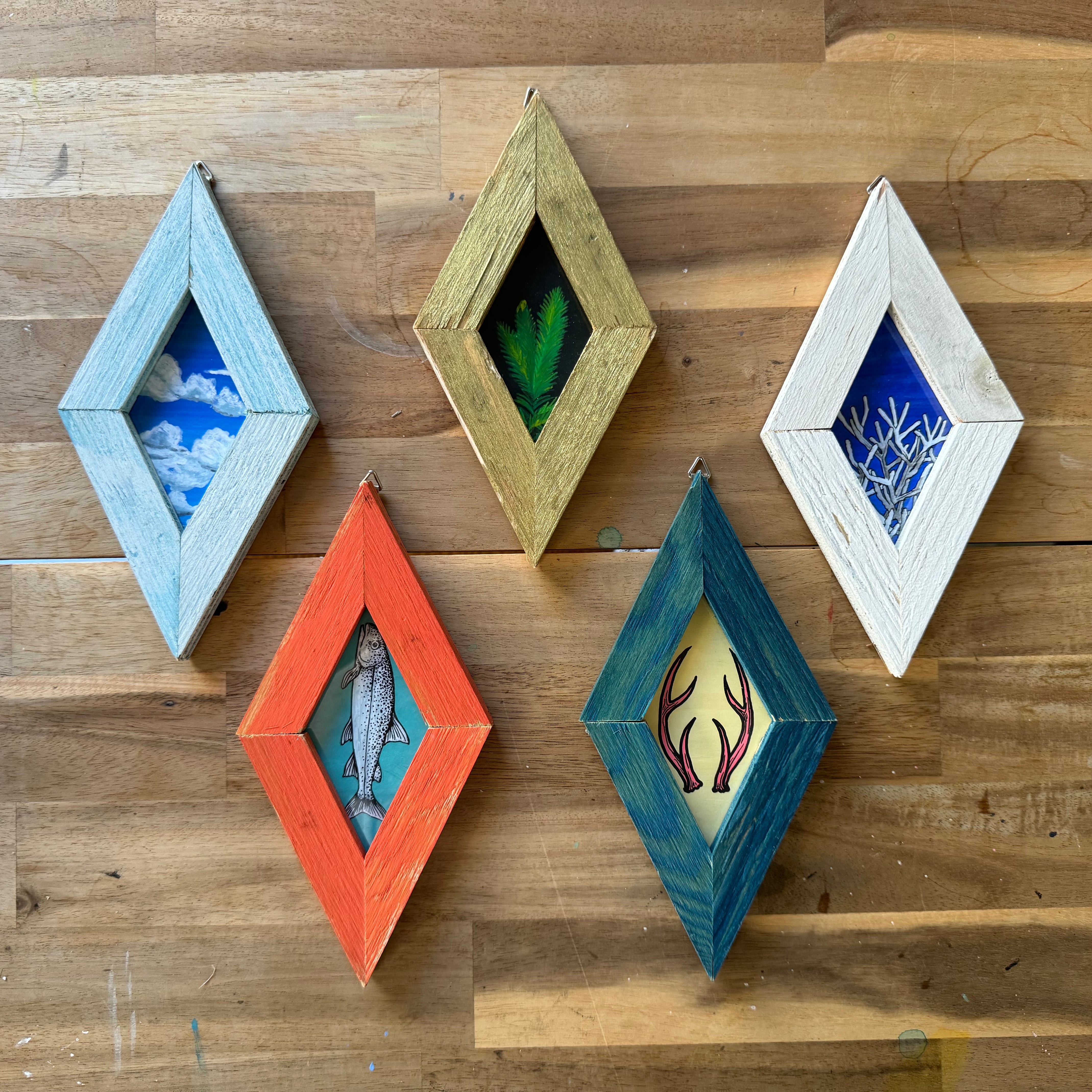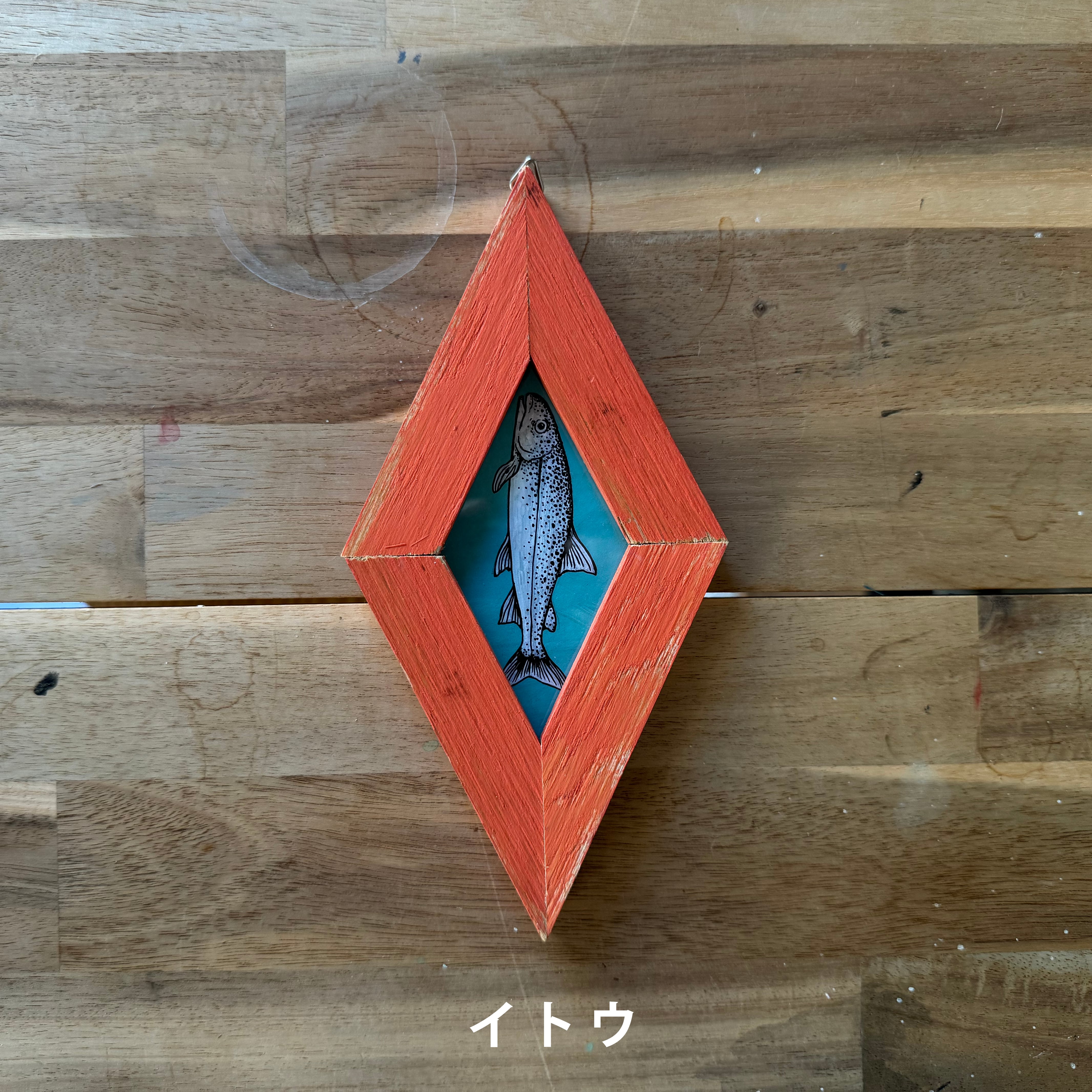 端材をアップサイクルしたフレームに入れたアクリル原画。